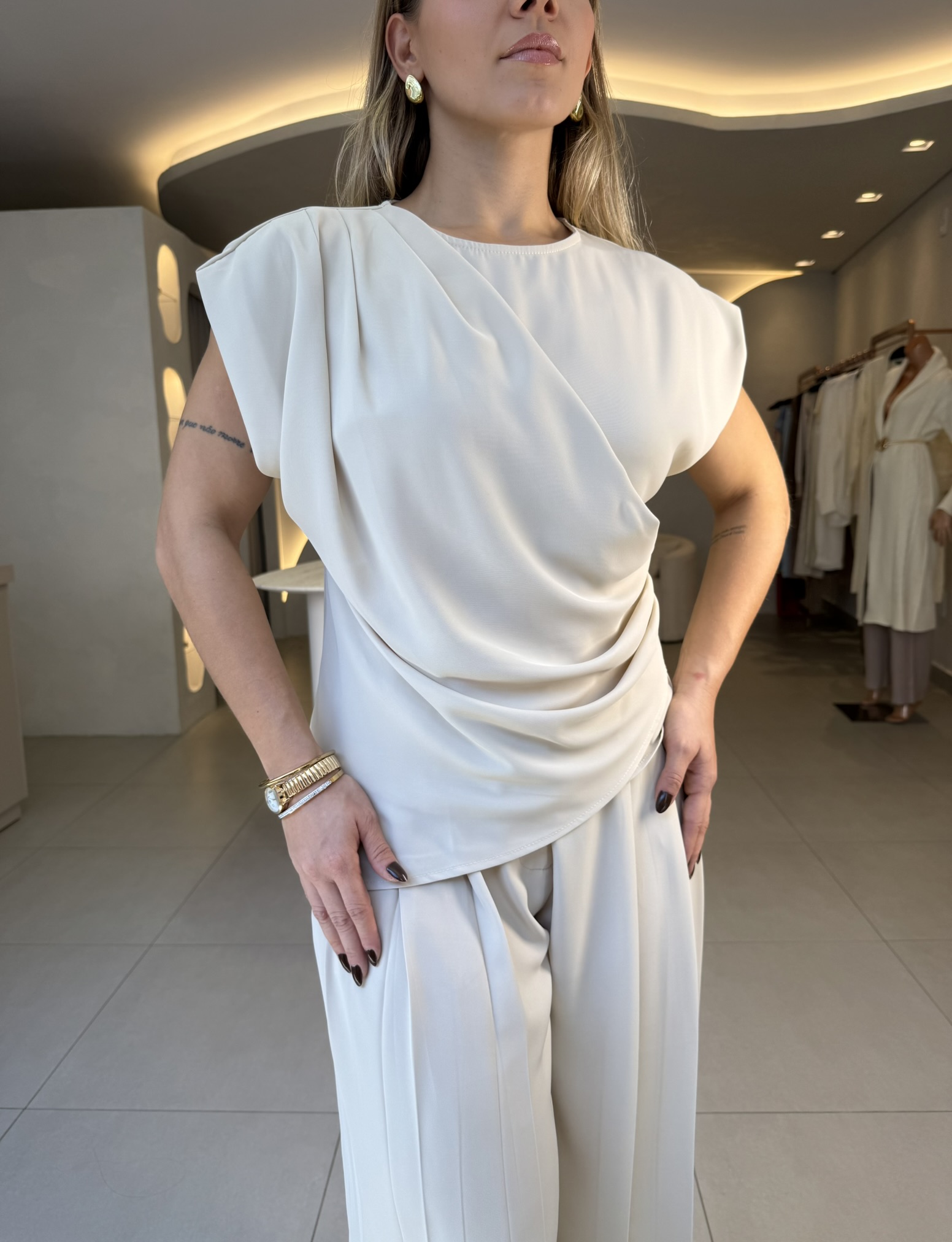 Blusa em alfaiataria com pregas assimétricas, ideal para compor looks sofisticados com um toque contemporâneo. O design inovador conta com pregas estrategicamente posicionadas na parte frontal, criando volume e movimento de forma sutil e elegante.