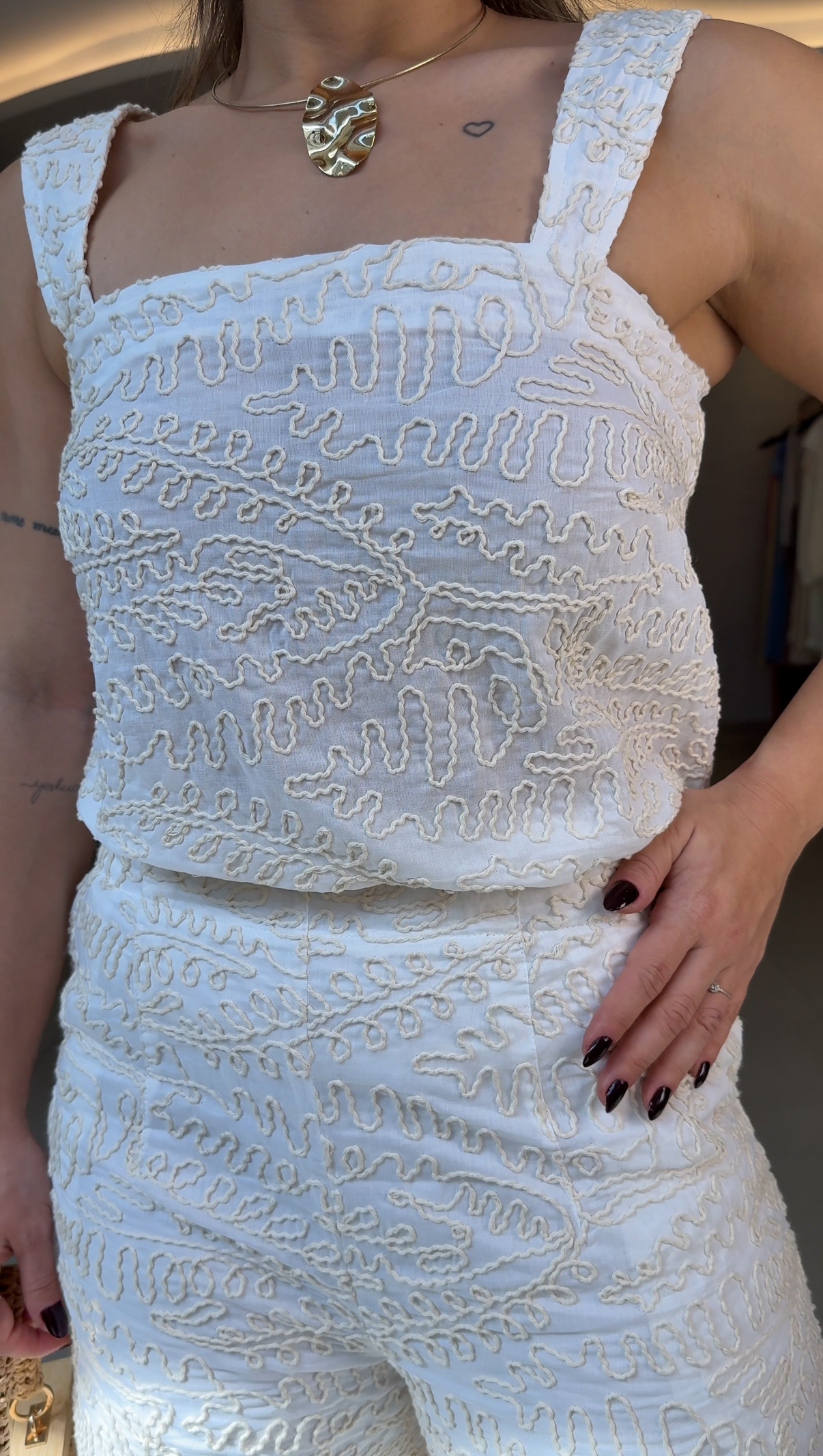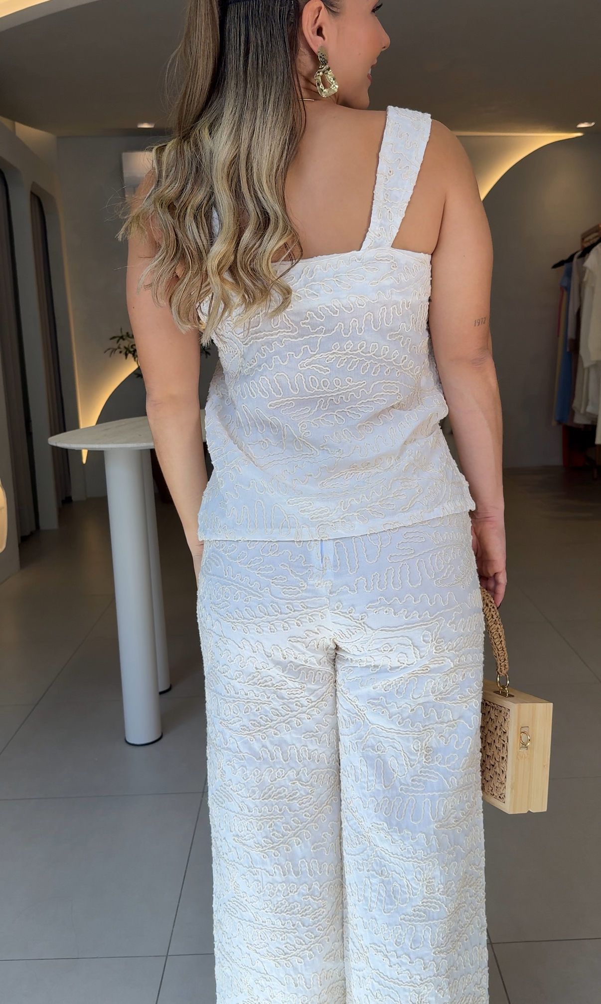 blusa confeccionada em 100% algodão texturizado, que confere sofisticação ao visual por meio do acabamento diferenciado e do toque encorpado. O tecido natural proporciona alta respirabilidade, conforto térmico e excelente durabilidade, sendo ideal para composições elegantes.