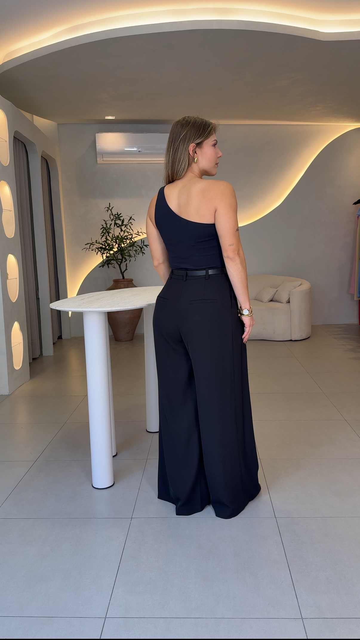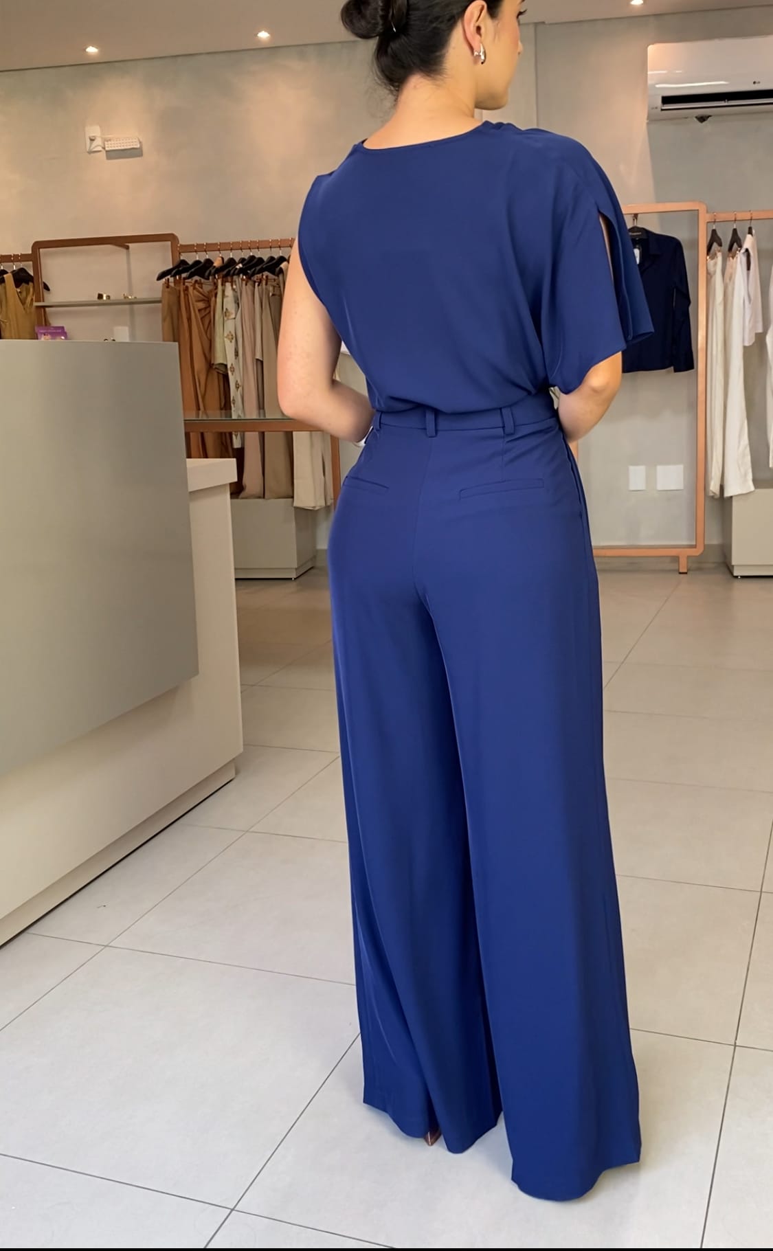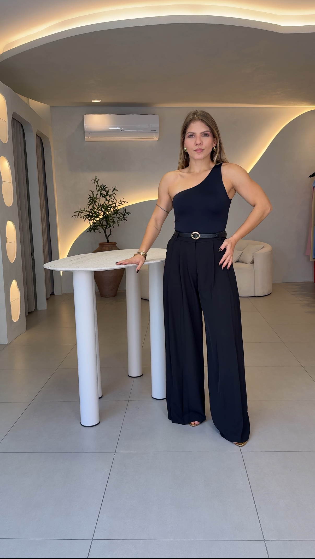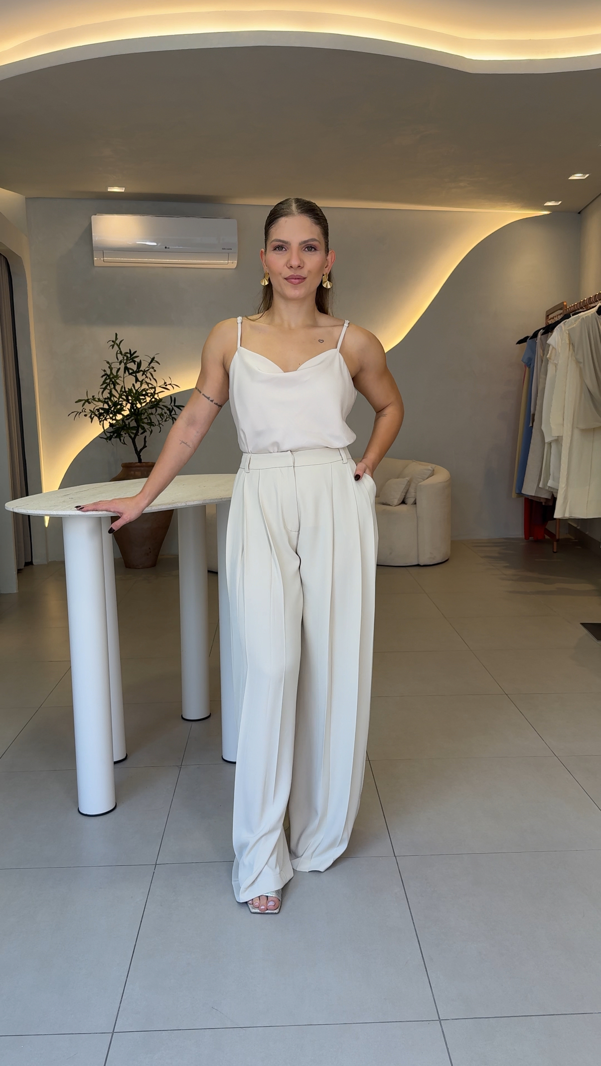 Calça Pantalona com caimento fluido, moderna e sofisticada. Destaque para as pregas frontais que alongam a silhueta.