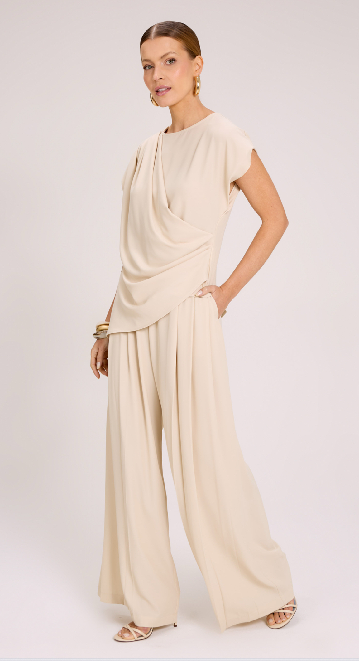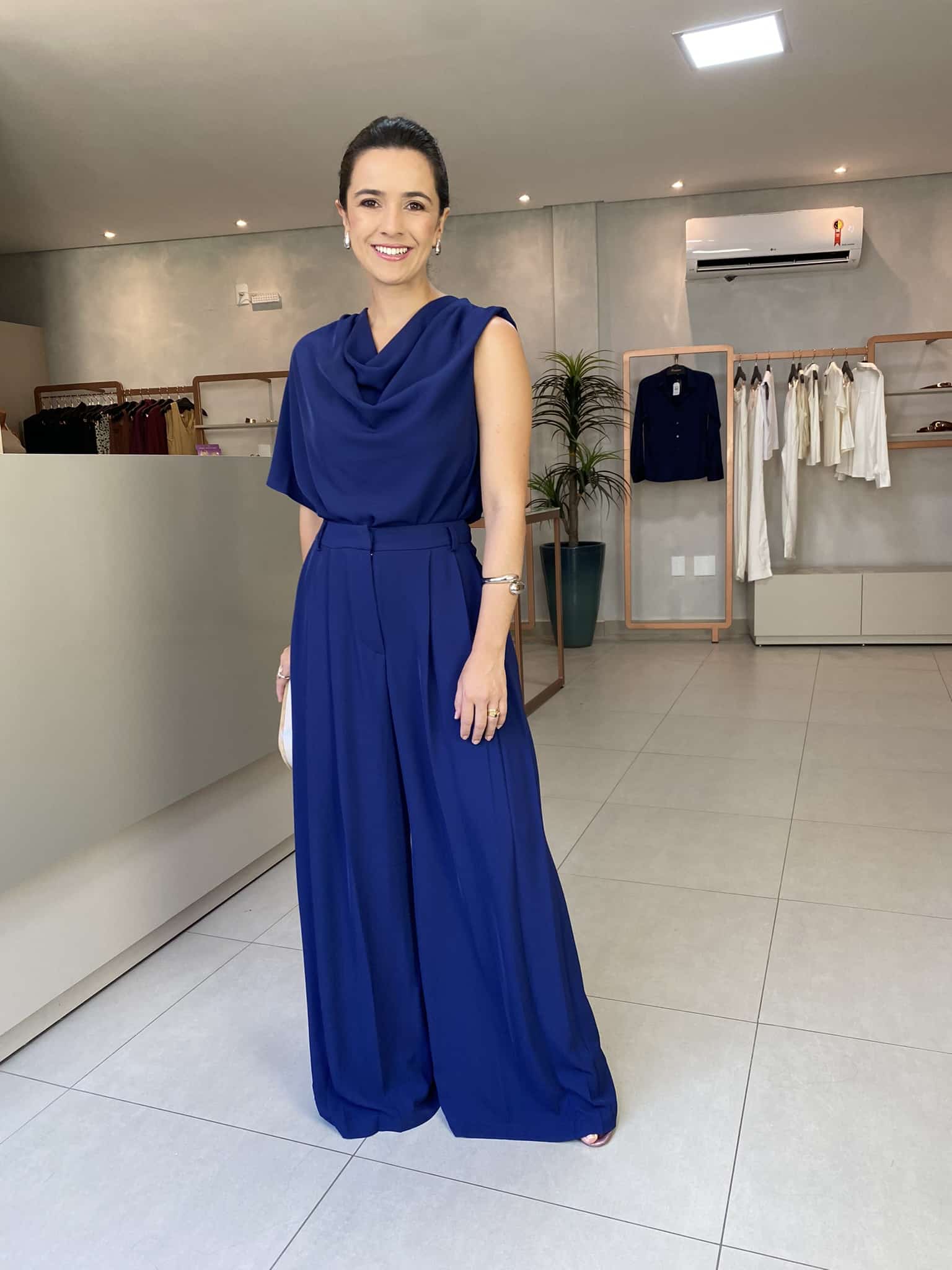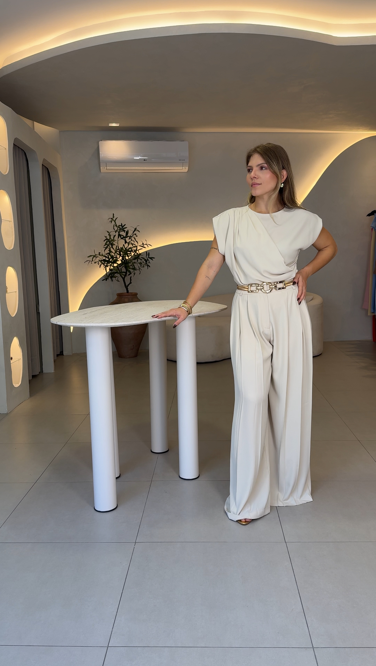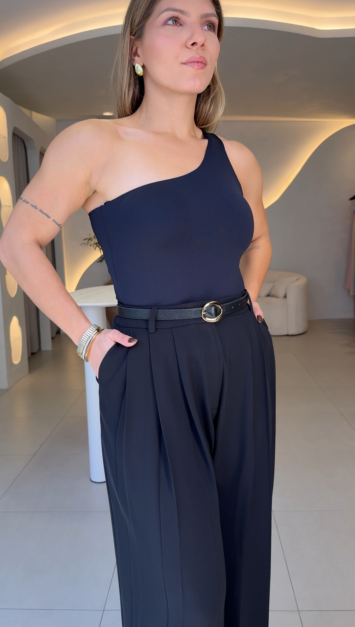 Calça Pantalona com caimento fluido, moderna e sofisticada. Destaque para as pregas frontais que alongam a silhueta.