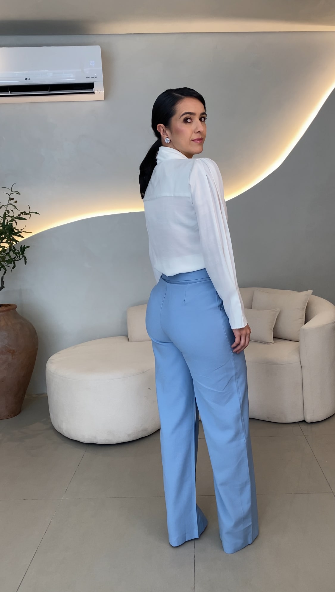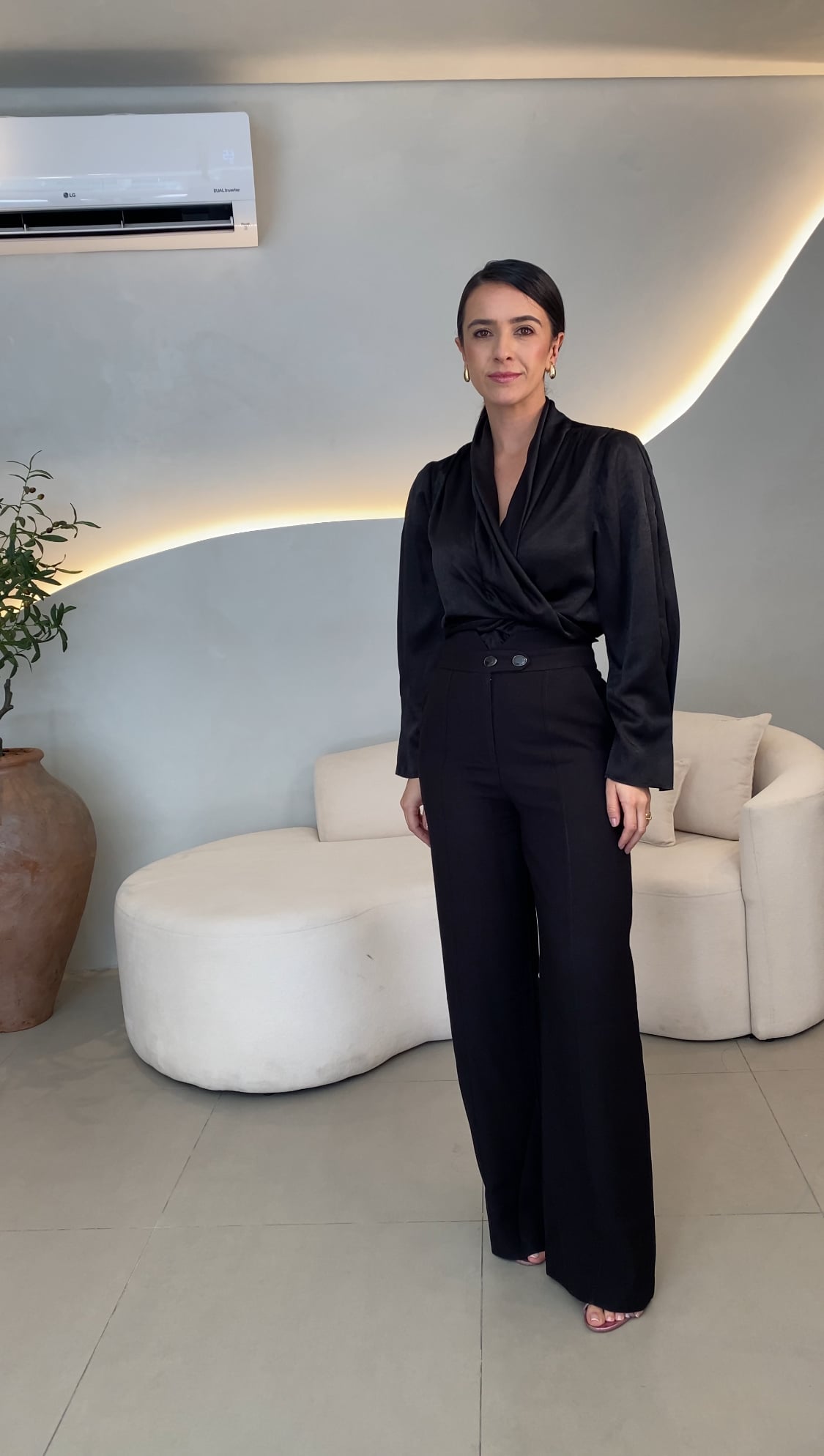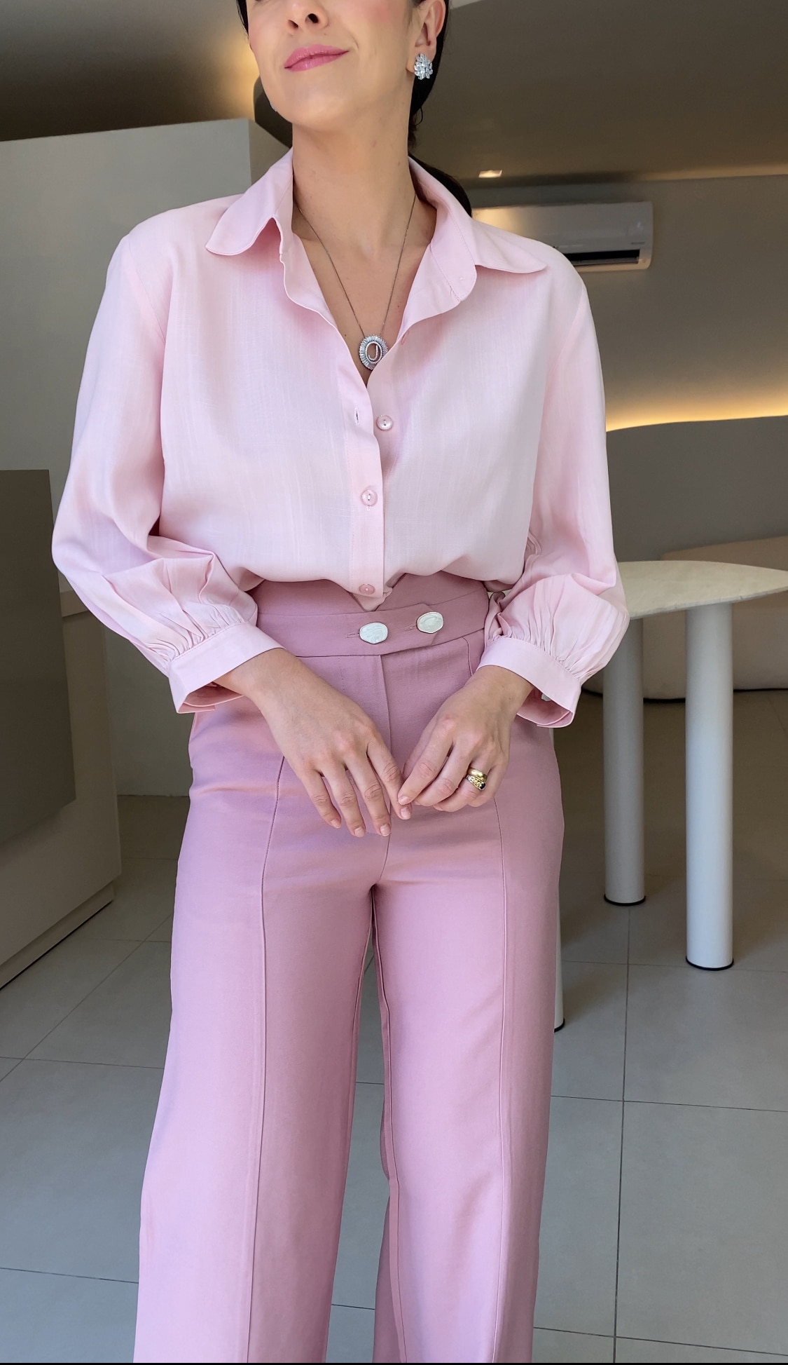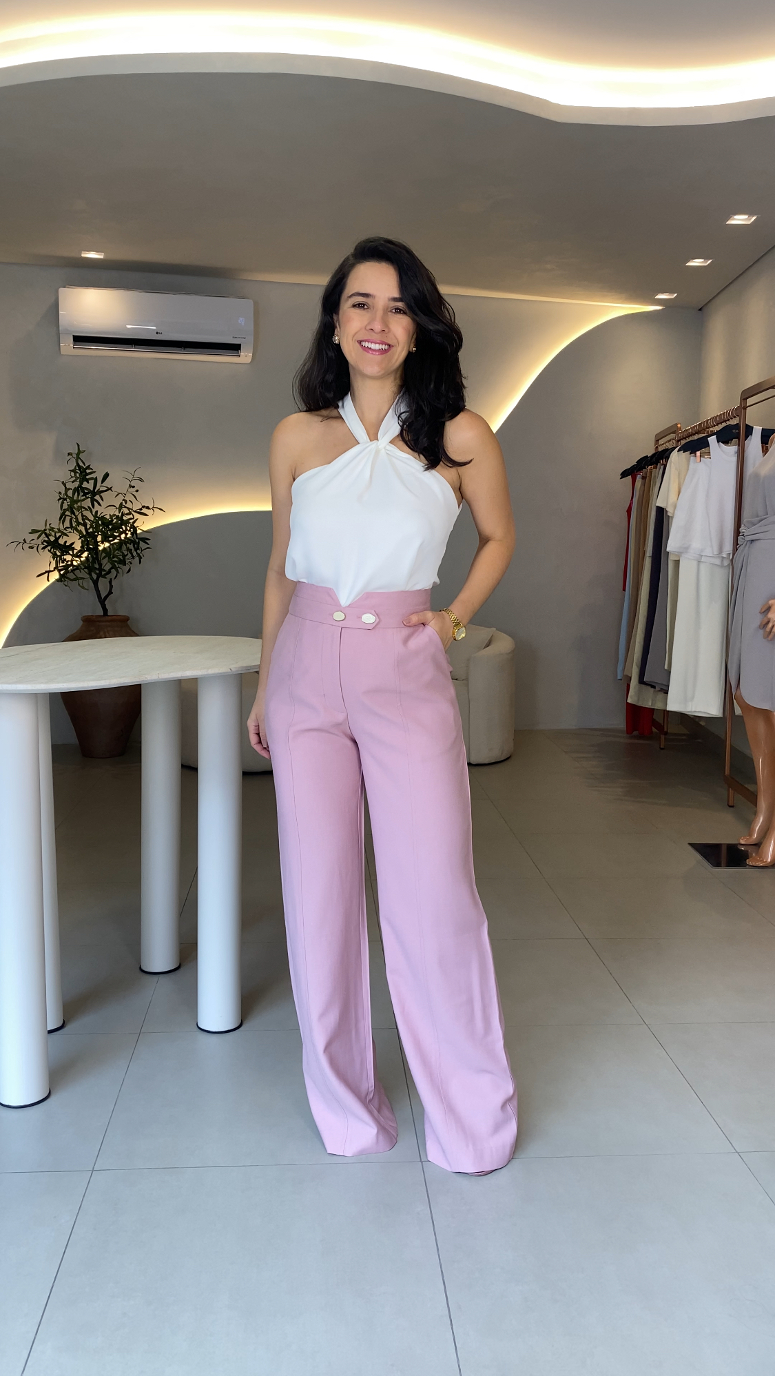 Calça pantalona com modelagem mais reta e cós cintura alta, proporcionando um ajuste elegante e moderno. O fechamento com zíper e os botões duplos esmaltados em formato orgânico conferem um toque de luxo à peça. Ideal para criar um visual sofisticado e elegante.