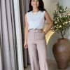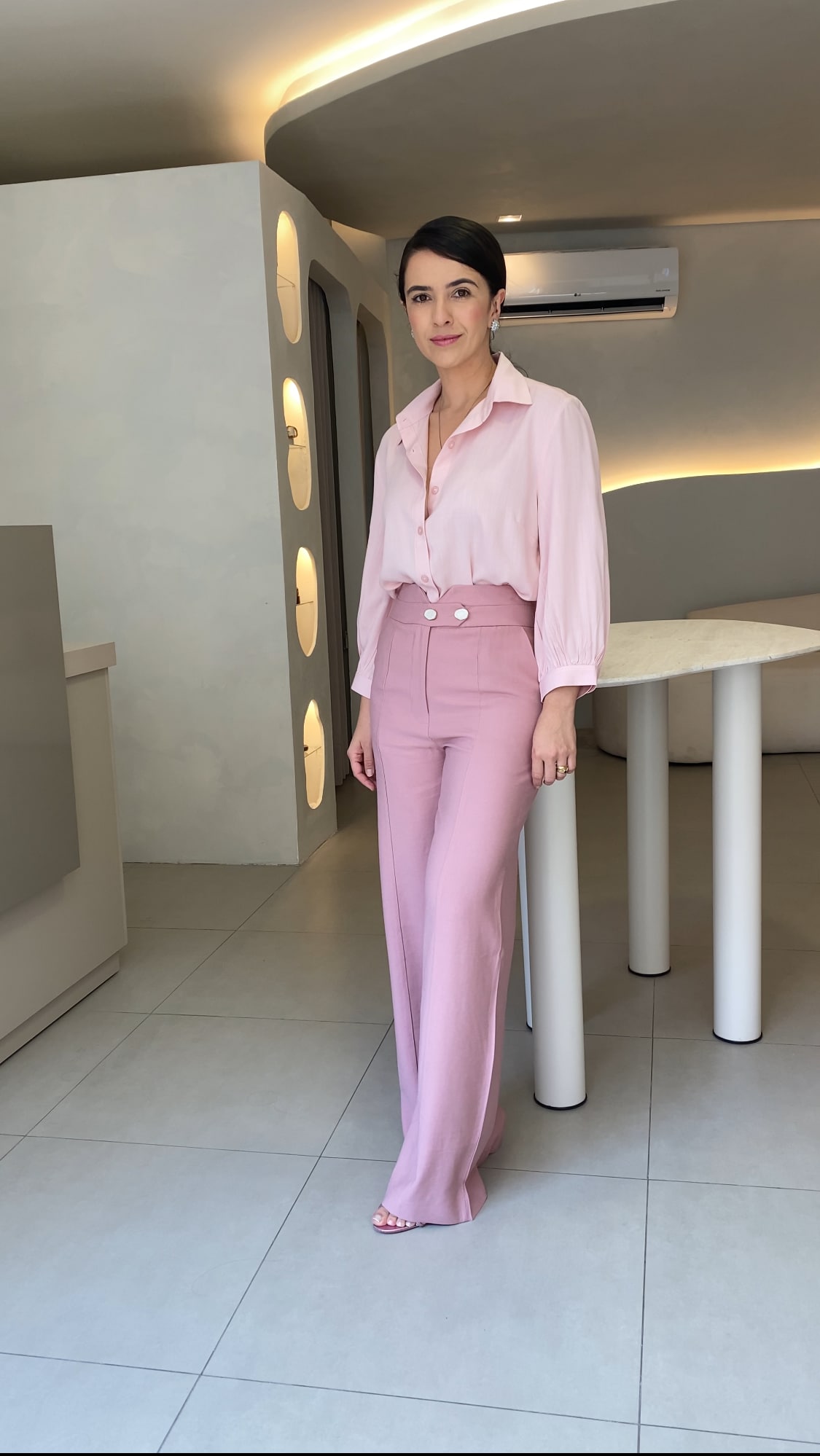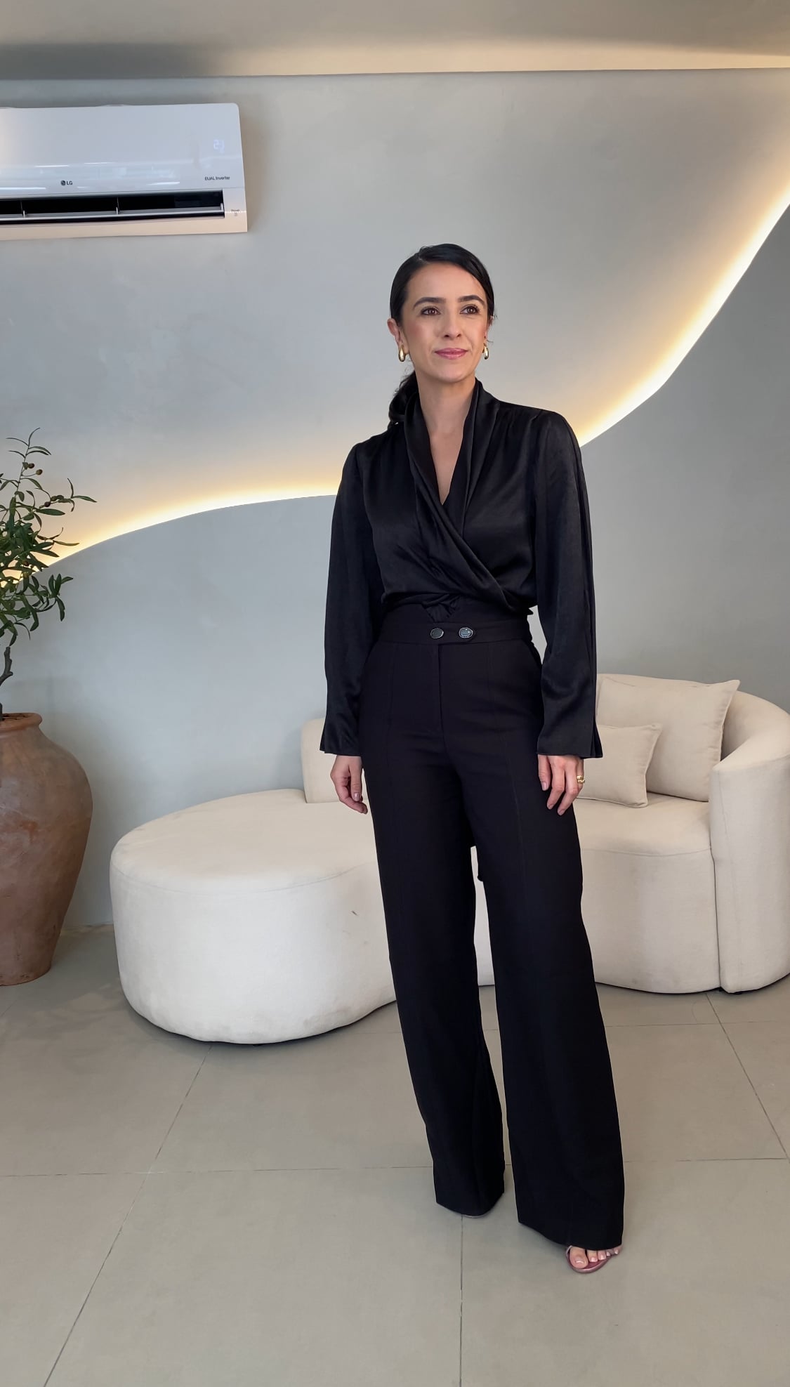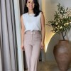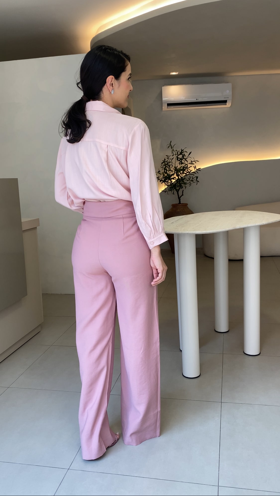 Calça pantalona com modelagem mais reta e cós cintura alta, proporcionando um ajuste elegante e moderno. O fechamento com zíper e os botões duplos esmaltados em formato orgânico conferem um toque de luxo à peça. Ideal para criar um visual sofisticado e elegante.
