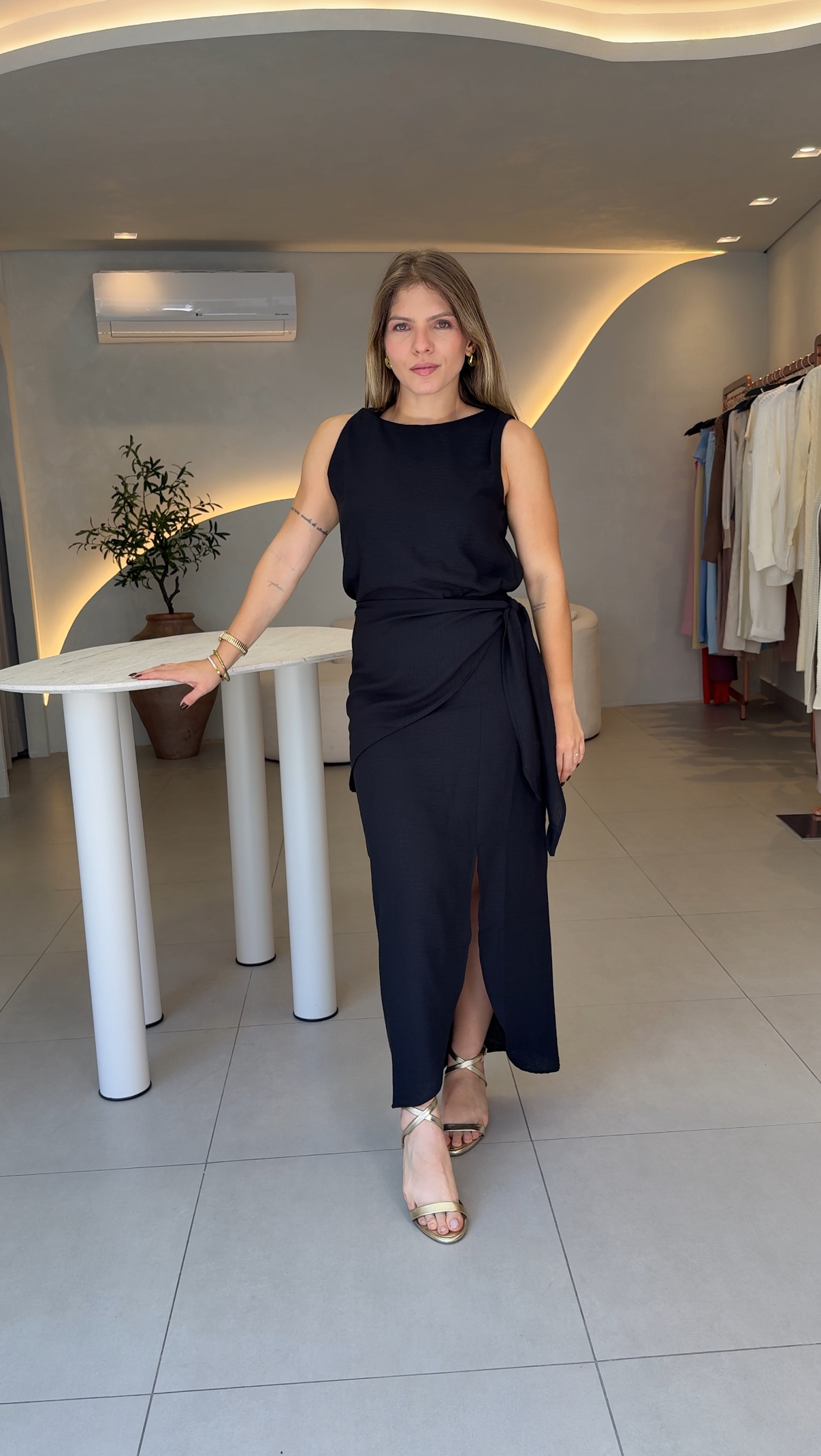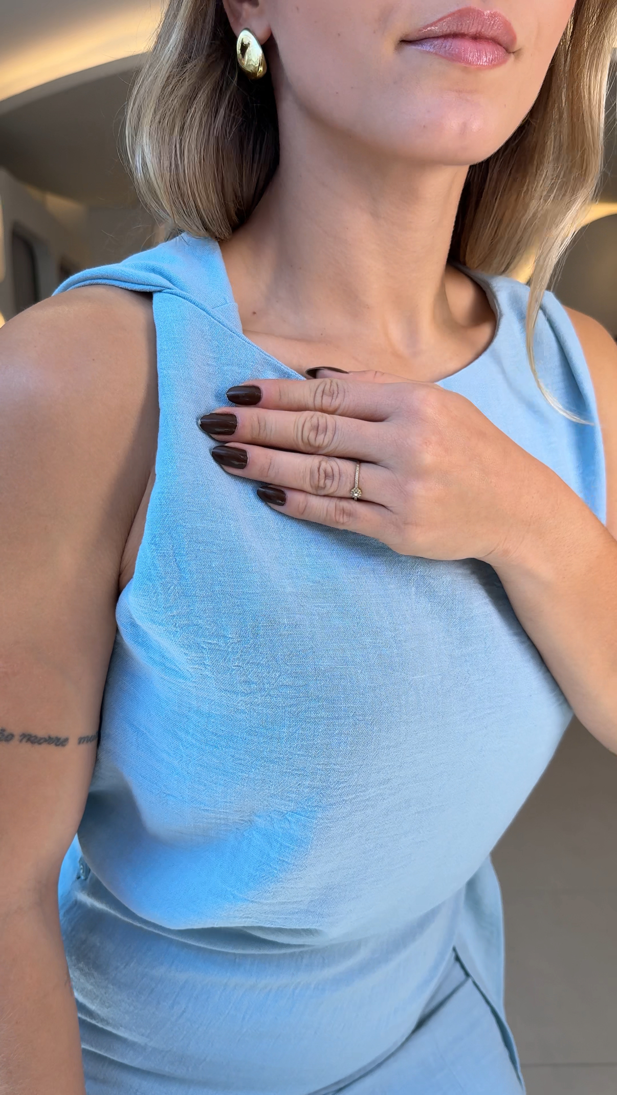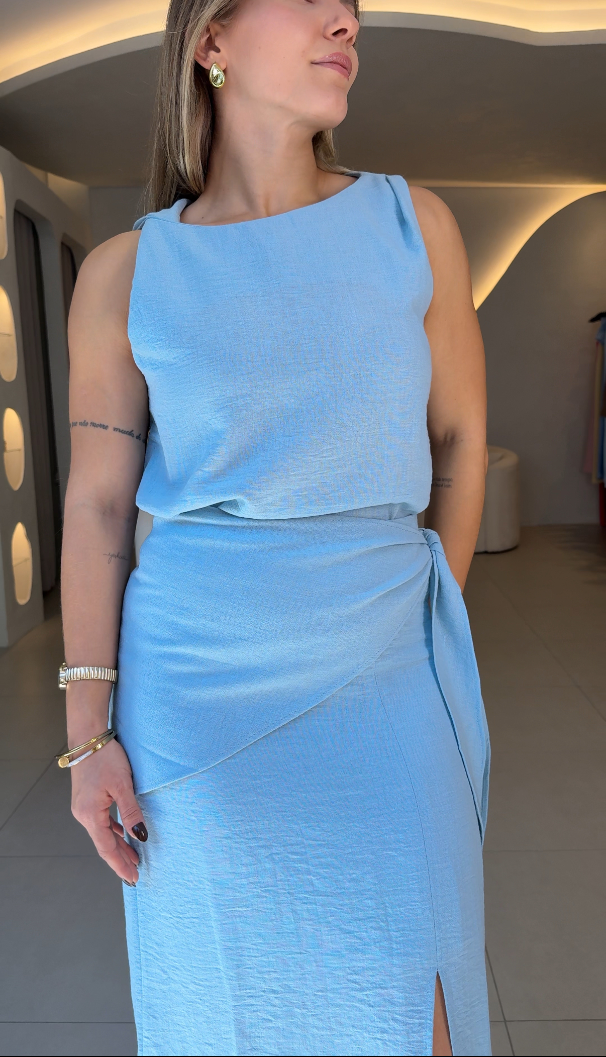 Conjunto sofisticado composto por saia com pala removível e blusa coordenada,com detalhe de torcida. A saia é toda forrada e contém uma fenda. O grande diferencial está na pala removível, que adiciona versatilidade e permite compor dois visuais distintos: com ou sem o detalhe sobreposto.