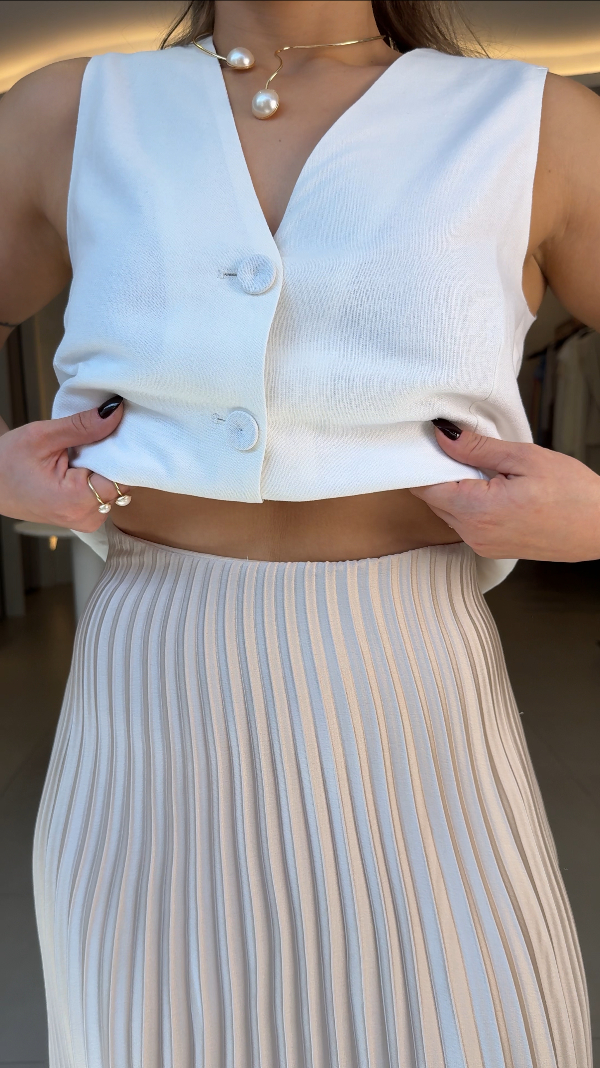 Saia midi plissada com caimento fluido e elegante. O comprimento midi confere um toque clássico, enquanto o efeito das pregas plissadas traz modernidade e dinamismo ao visual. Versátil, transita com facilidade entre produções formais e casuais, compondo looks refinados para diferentes ocasiões.